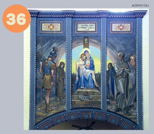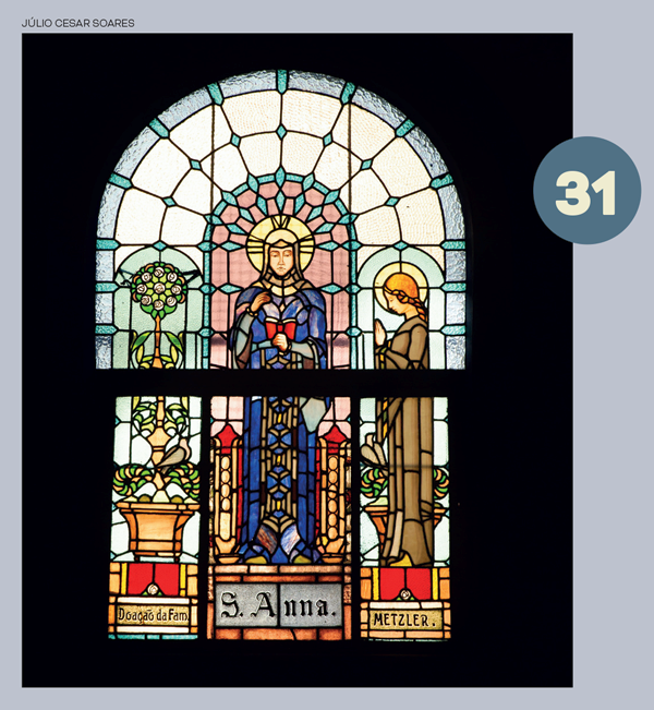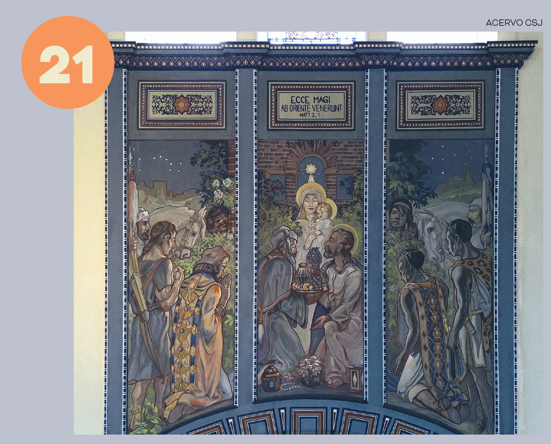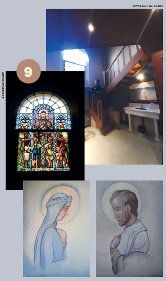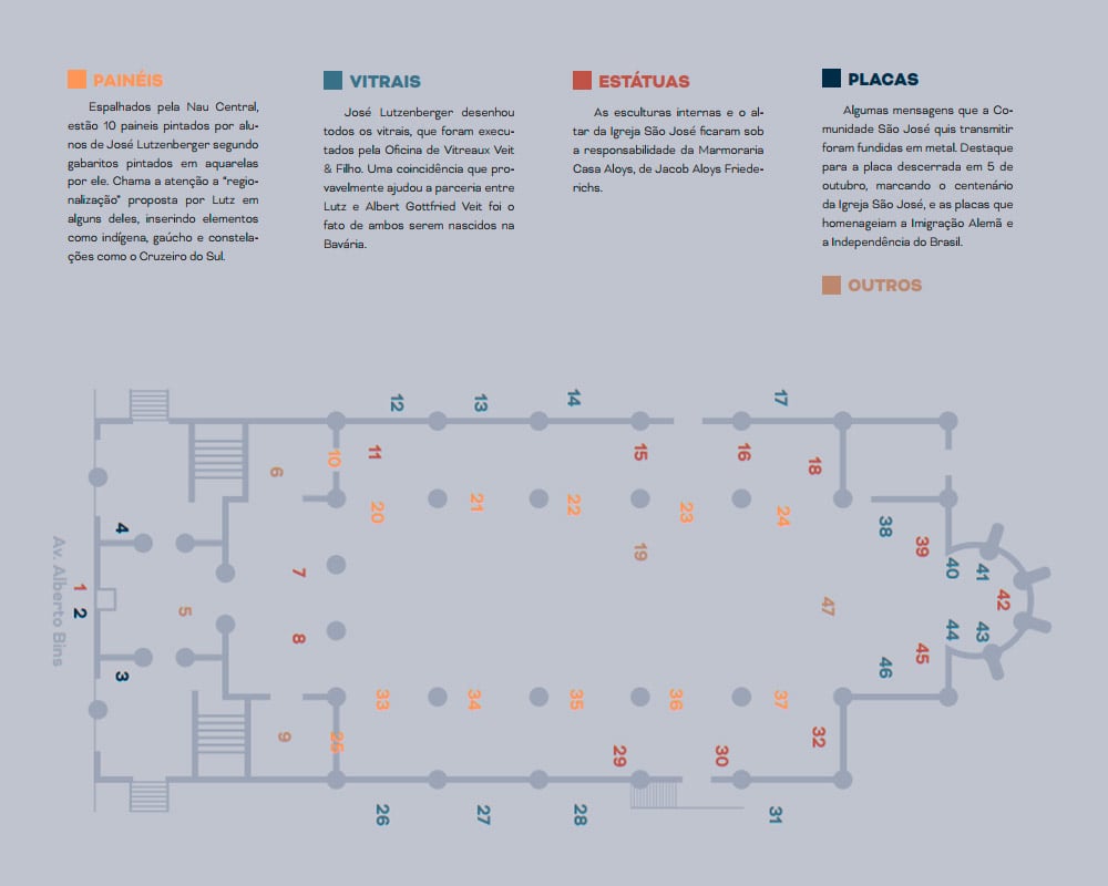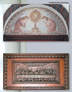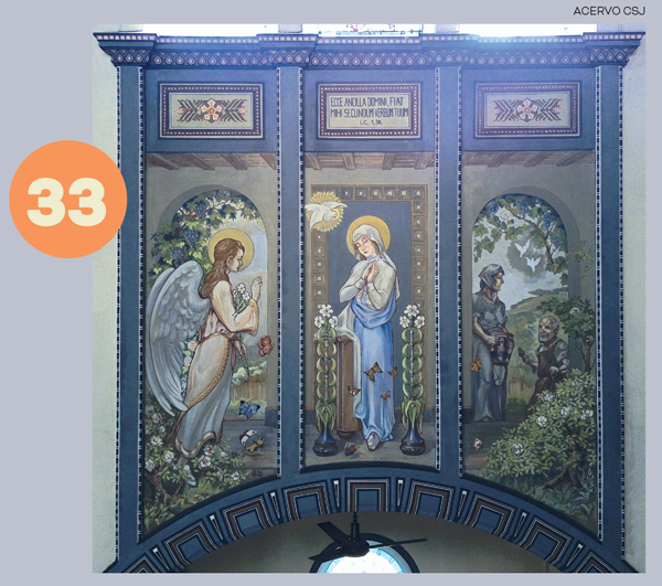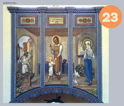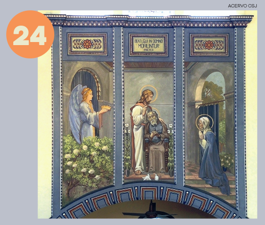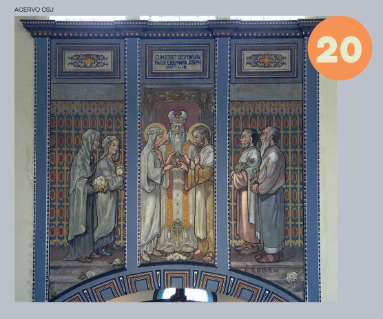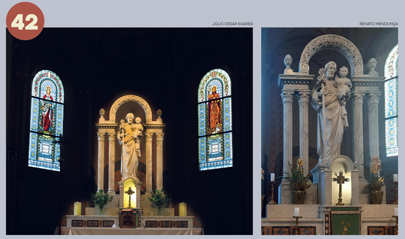 Pormeio de arcos, colunetas e outros ornamentos, ele nos oferece uma sensação de profundidade. A estátua de São José tendo ao colo o Menino Jesus, criação do escultor alemão Alfred Adlof, remete à estrutura de arcos e murais que Lutzenberger impôs à decoração interna na nave central.